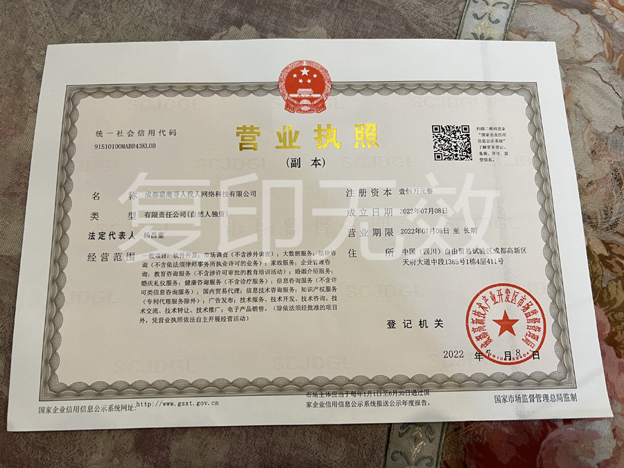 成都獵鷹尋人找人網絡科技有限公司是一家已經注冊的正規找人公司,通過合法途徑幫您尋找丟失之人。